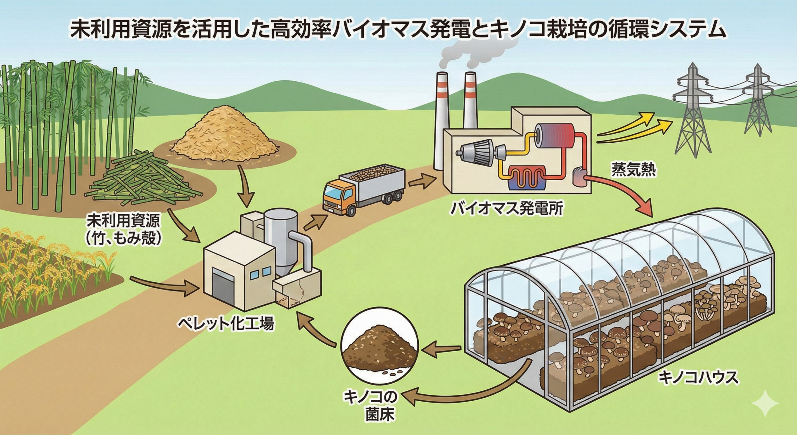 バイオマスエネルギーを利⽤した、オーガニックきのこの⽣産事業