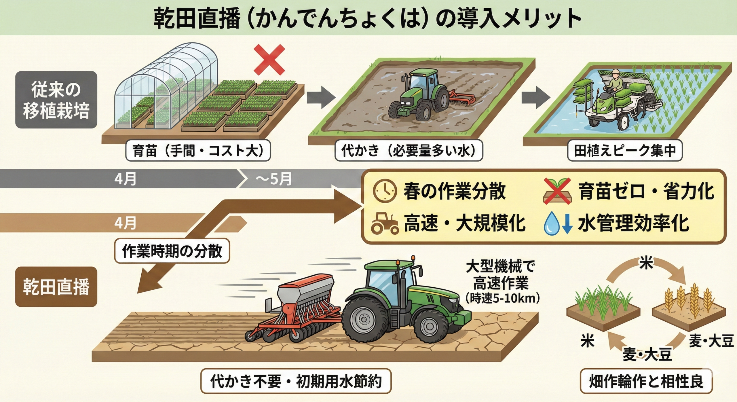 私たちが導入する「乾田直播」は、この課題に対する決定的なソリューションです。