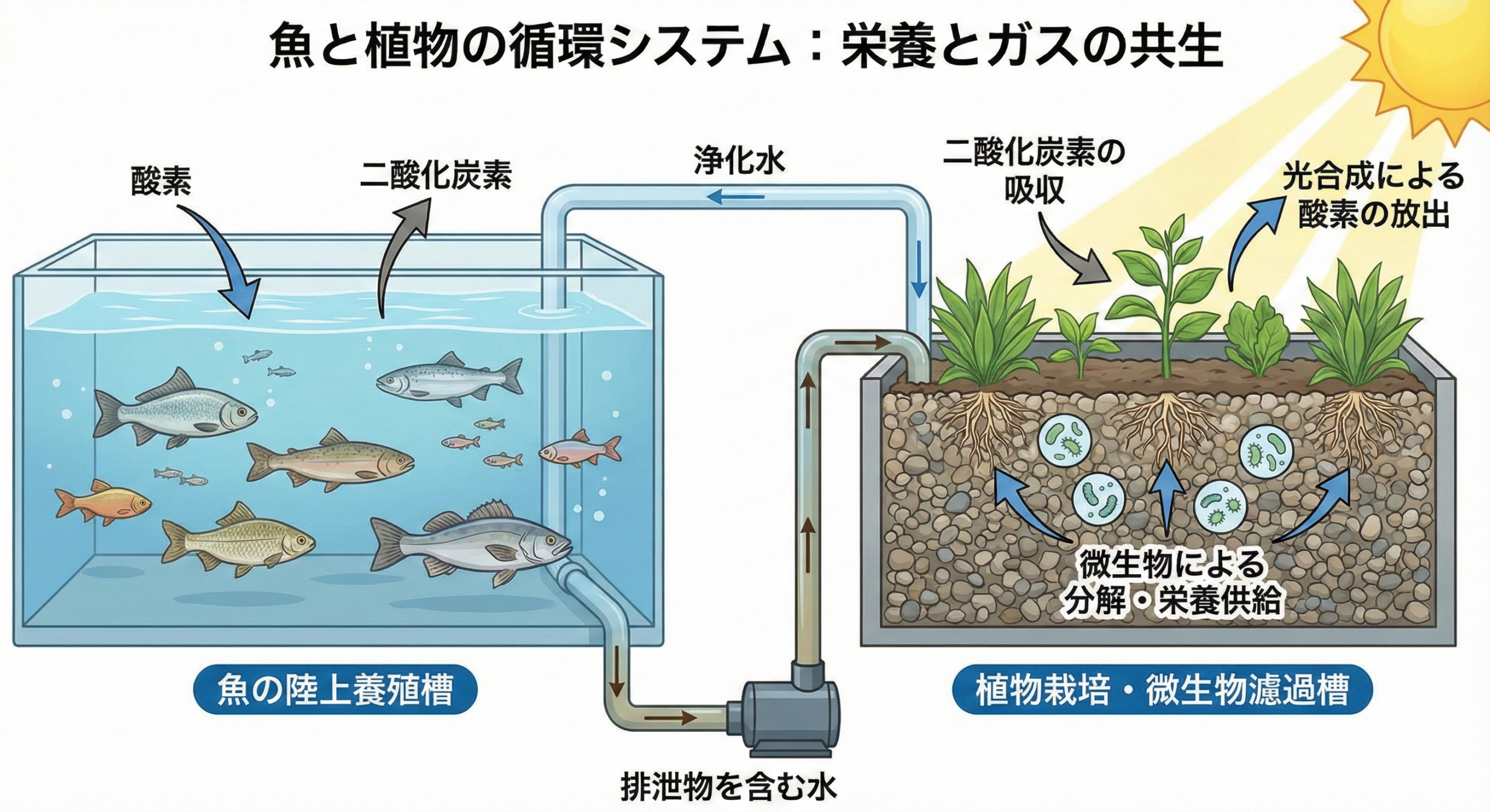 アクアポニックスとは、 ⽔産養殖の「Aquaculture」と、⽔耕栽培の「Hydroponics」からなる造語 で、⿂と植物を同じシステムで育てる新しい循環型農業のカタチです。