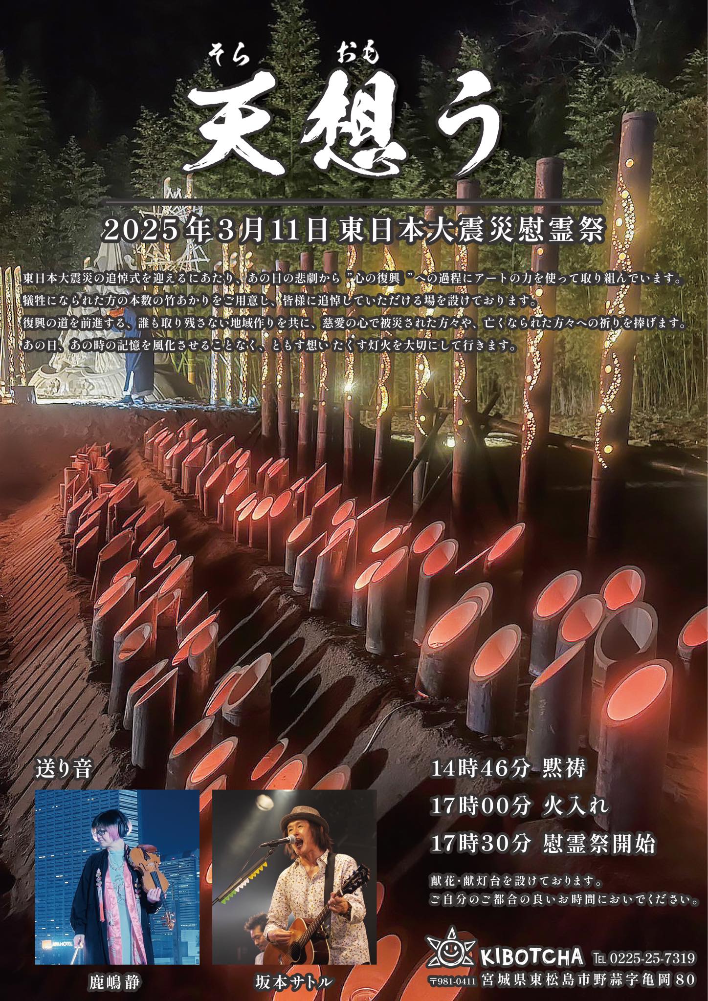 本年で第6回目を迎える今回は、「竹・砂・食・音・遊・絵・心」の7つをテーマに、KIBOTCHA(東松島市野蒜)を会場として多彩な企画を展開します。